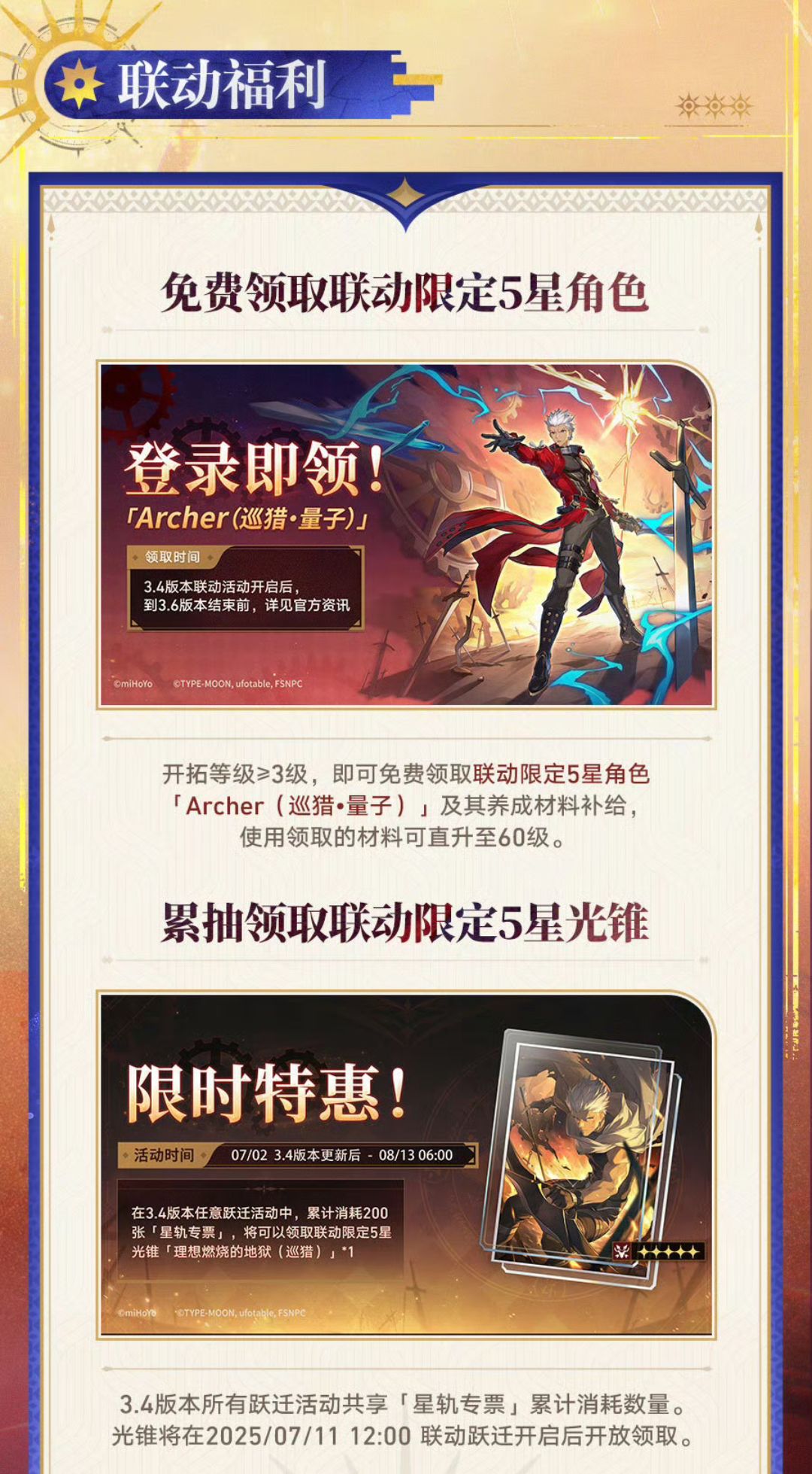 🔵联动福利:免费领取联动限定5星角色Archer➕联动限定5星光锥