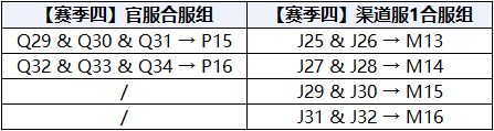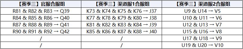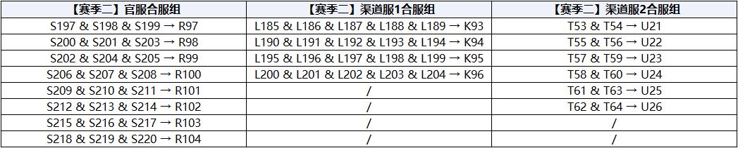 【官服】赛季一:合服后的服务器变为以S开头的服务器编号;赛季二:合服后的服务器变为以R开头的服务器编号;赛季三:合服后的服务器变为以Q开头的服务器编号;赛季四:合服后的服务器变为以P开头的服务器编号。