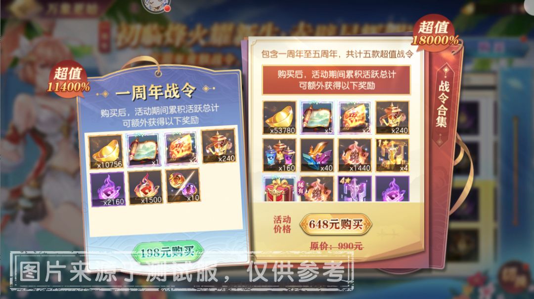 同时小将军也可以付费648元购买五战令优惠组合包,购买并满足累计活跃值条件后将会解锁五个战令的付费档奖励,需要注意的是,一旦购买任意单个战令特典后,不可再购买组合包。