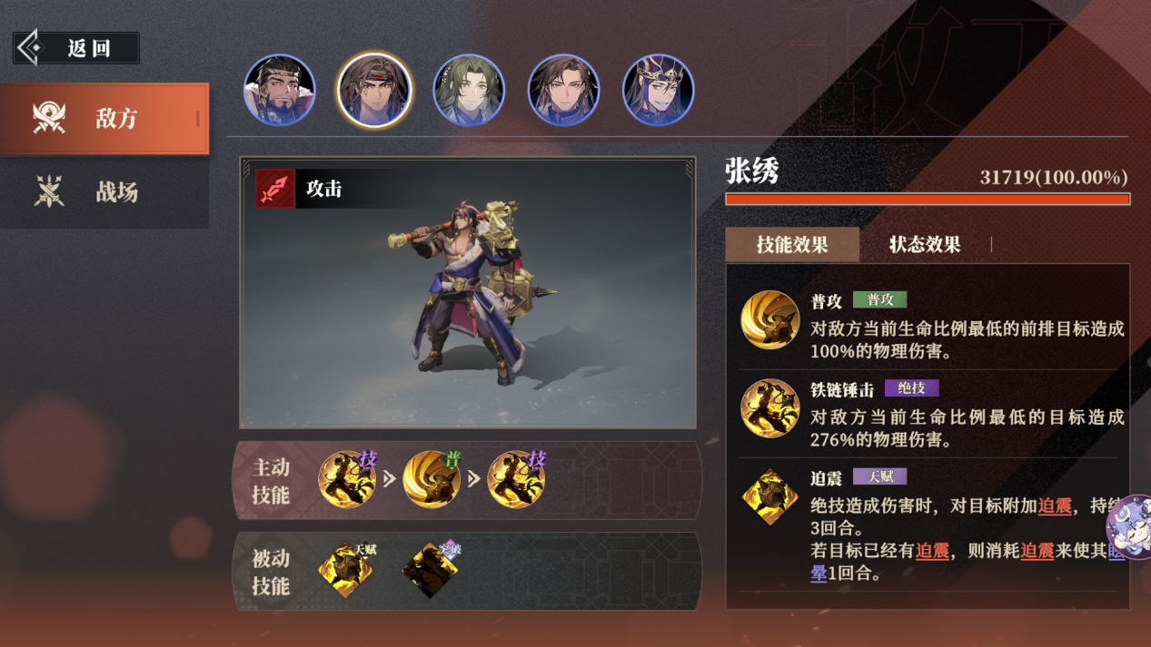 由于战场特性敌方全体物理免伤提升100%,不适合上阵物理输出,但请注意敌方不是物理免疫,如果输出量不足,物理输出也可以上阵,可以考虑替换曹仁或者孙权。另外对面贾诩李儒能上毒,要及时驱散中毒。如果出现减员的情况,可以回溯到孙权的回合,通过孙权的绝技给到不同的武将,来改变行动顺序和提供必定格挡来改变战局发展,另外孙权的一火突破技能让敌人封技,可以在武将释放绝技前封技他,能有效降低生存压力,帮助过关。如果不上孙权,可以把岳峙回云给乔姝,乔姝的绝技可以给全体上增益,这样站位最靠前的友方能获得岳峙回云的效果。战斗中建议先集火李儒,再收割张绣,然后带走贾诩,剩下董卓和陈宫就没有了威胁。