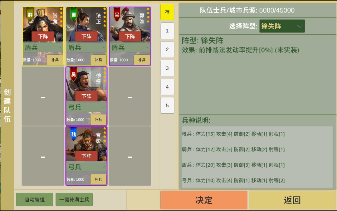 其中的优劣一眼可见,配合武将所处位置来灵活设定,防守用和进攻用也各有不同。例如:防守用则大量使用盾兵这种血量和防御都极其强悍的兵种,而进攻时则最好使用枪骑等能快速打击的兵种。弓兵则在攻防中都适合,但血量堪忧,需要放置后排稳定输出。