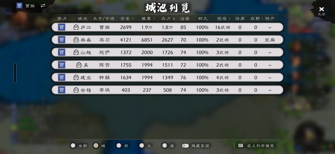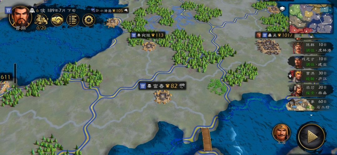 开局出6队轻骑兵,分别拿下陈留周边的府港和许昌、庐江、柴桑、山越、吴、建业、会稽7座空白城。这里要注意夏侯渊是占城助力,因为他有兵贵神速。