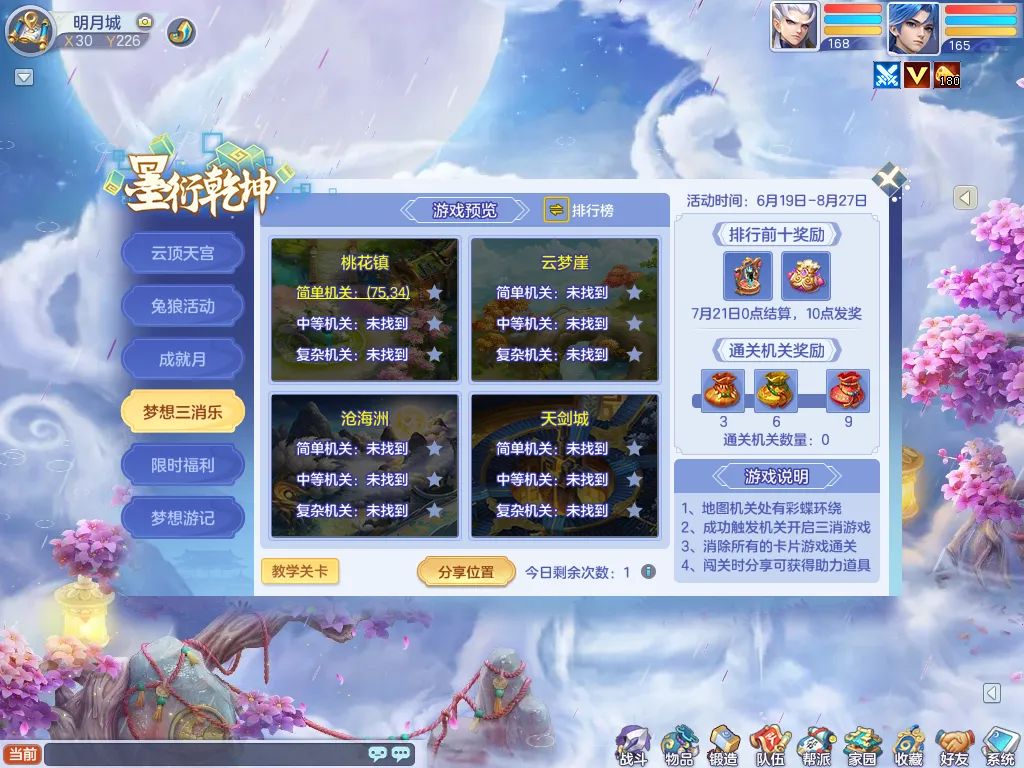 少侠需要在桃花镇、云梦崖、沧海洲、天剑城四地寻找彩蝶环绕的机关,触发机关后即可开启挑战!