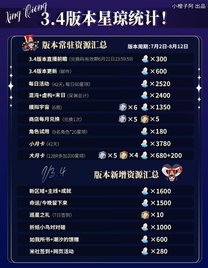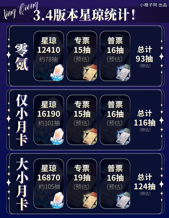 这一篇是星铁v3.4新版本抽数统计,整体分为总体统计与各内容版块统计,总体统计分为了:零氪、小月卡与大小月卡,方便大家根据自身需求选择查阅。