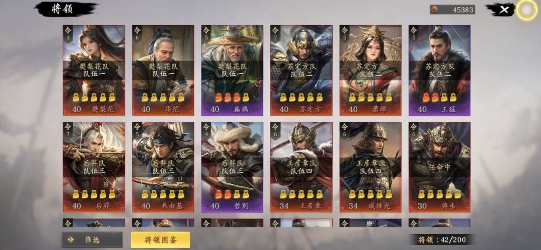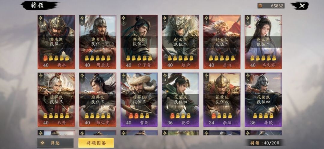 关于抽将的体会,开始容易得的的潘凤怒气技体系好用搭配姜子牙可以苏定方岳云代替组骑兵队,新手第2天送的典韦可以组个刀兵队搭配梨花华佗扁鹊都可以,第3队建议出弓兵队,系统有送哲别和公孙瓒,后面可以后羿等代替,建议全部抽大卡池容易出四大核心吕布杨戬张巡陆逊,有抽到枪兵的赵云岳飞可以双环枪。