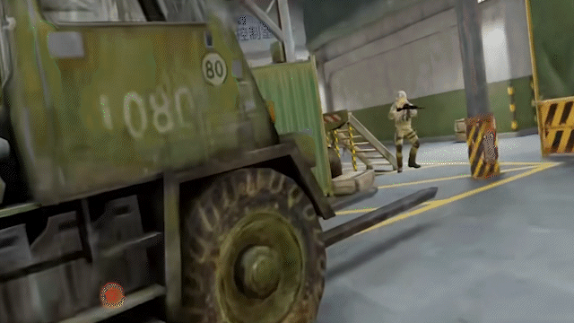 如图所示打破玻璃下去,大跳来到对面高箱,来仓库撤离点的敌人第一时间绝对注意不到,偷掉一个不在话下~