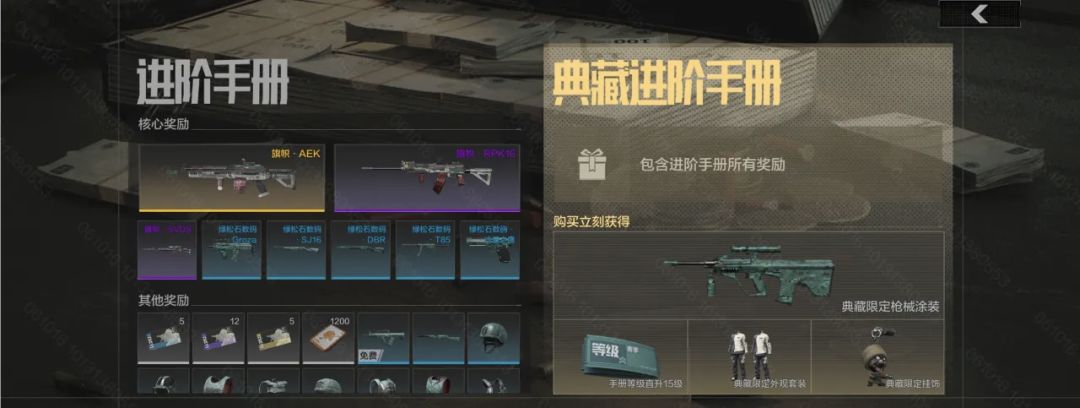 手册内除了大量枪械涂装和套装券外,依旧会有1200装扮券可供先锋们解锁获取,同时解锁进阶手册可获得金色品质枪械涂装【旗帜·AEK】,解锁典藏进阶手册获得典藏限定外观套装【行走深空机能套装】!