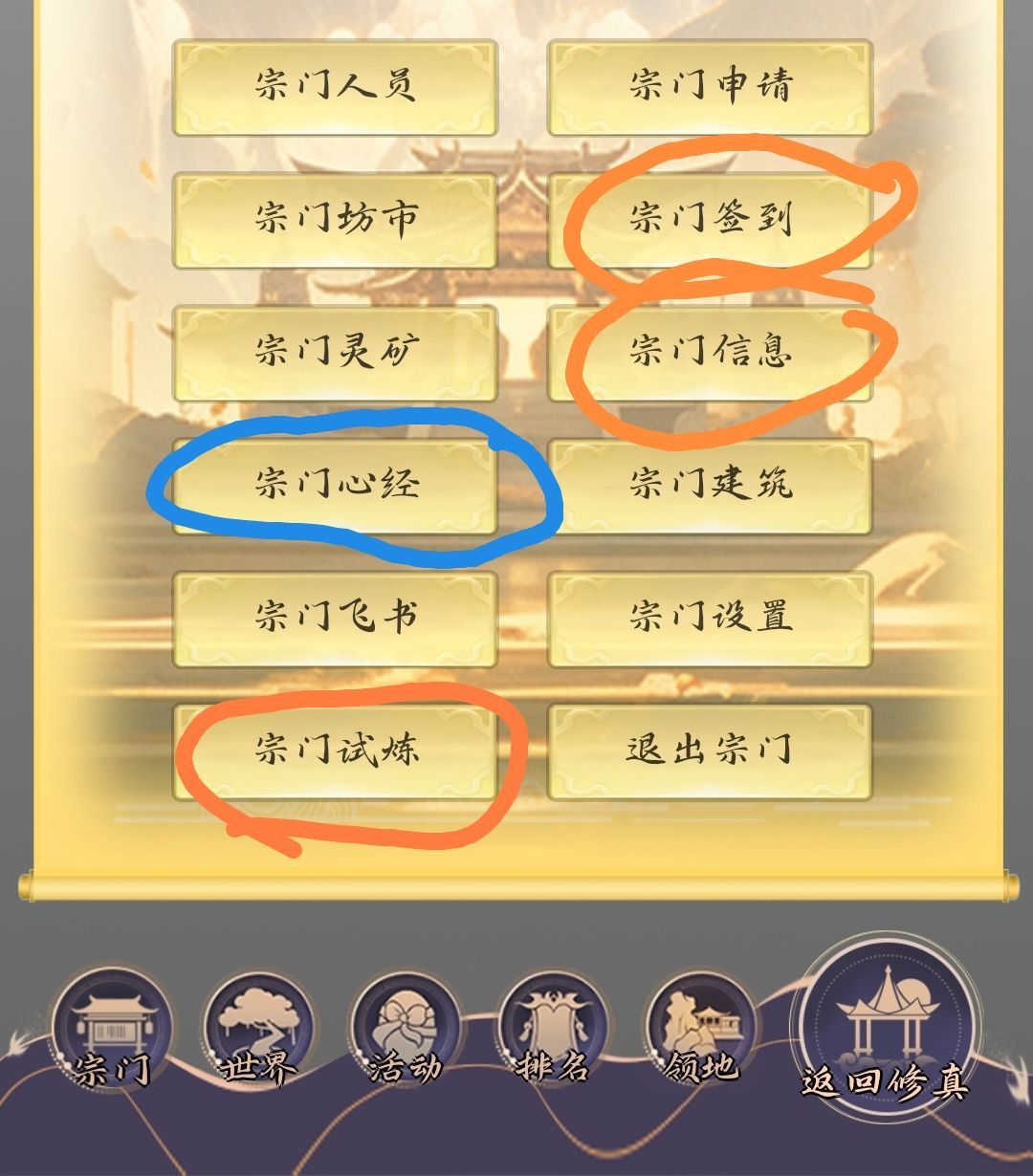 ☞宗门,图六,宗门签到,宗门信息捐献,宗门心经上线就看看参悟结束没,可以领经验,领完接着参悟,宗门试炼能打过就打。