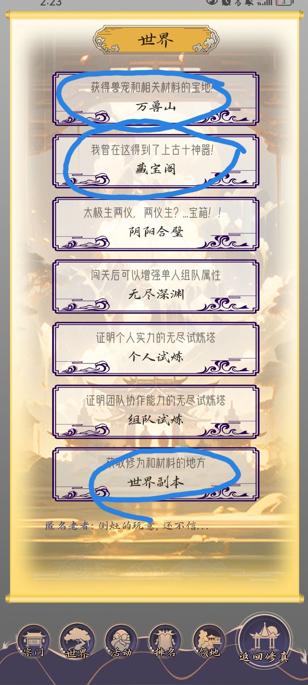 ☞世界,图七,万兽山无尽深渊前面说了。藏宝阁一天九次最好探索完,不想研究坐标直接点探索吃保底。阴阳合璧每天可以领几个壁,没人合也进去领一下(合璧也是每日任务,可以弄个小号或者群里喊人合璧,或者挂上去放上一个壁等一有缘人,就算你下线你创的房也会保留一些时间)。个人试炼能爬则爬,不能爬,扫荡,然后领一下层数奖励(每天可领一次,每日任务)。组队试炼能爬就爬,领层数奖励。世界副本有能打的就打一下。