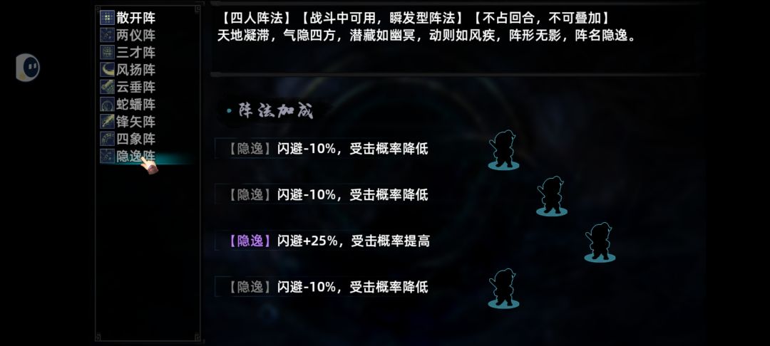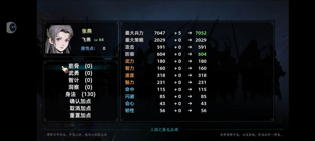 飞燕是目前版本后期最强盾,版本更新之后只会更强!首先阵法选择隐逸阵,后期有了这个阵才能转盾(因为是通关后发现的,具体什么时候能成型靠各位尝试了),64级淬炼全点身法,补俩淬炼丹到18%闪避,最大闪避=18+阵法25+承影剑·赵客10+虬龙套5+盗马3+轩辕剑10+谏逐客令5+天堑4+日月同宫5+回燕无明5+闪跃丹5+吃满淬炼丹3=98,最大计闪=98-18-4-3+三商君6=79,我淬炼丹大部分给赵云了,所以是95闪避79计闪(回燕无明和日月同宫要进入战斗才生效,面板不显示),但是后面版本肯定会更高。
