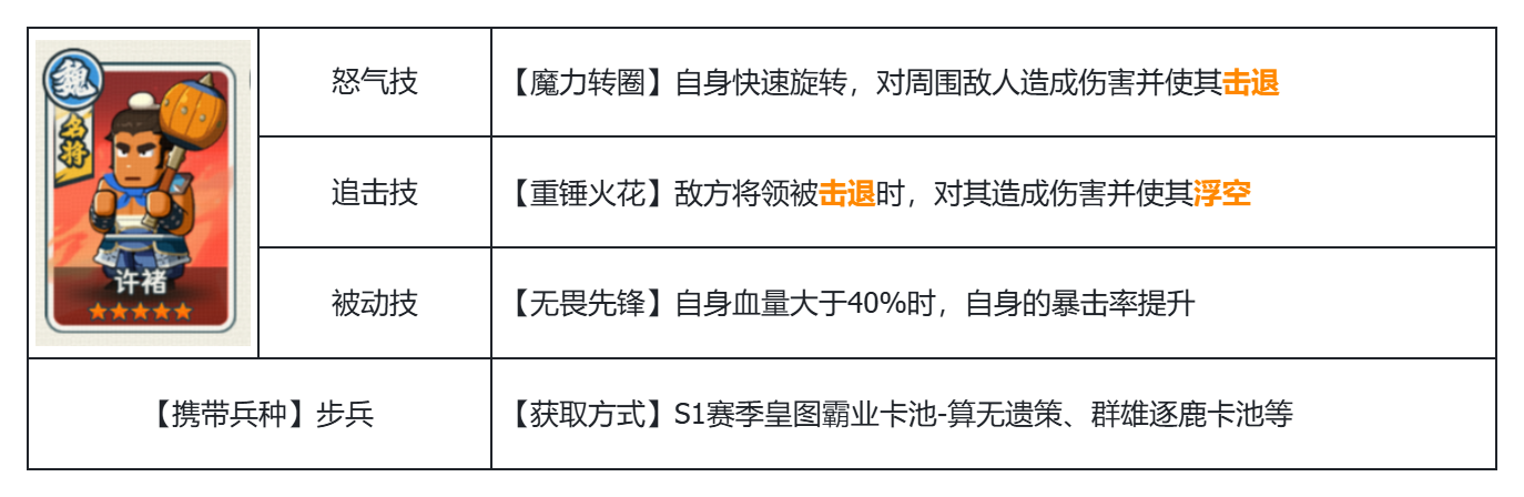是魏国的武将,武力属性优秀,将其他委任到训练场、粮仓、加工厂等需要武力值属性的建筑可以提高对应的工作效率。