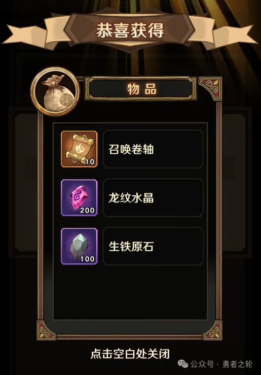 :召唤卷轴*10 龙纹水晶*200 生铁原石*100