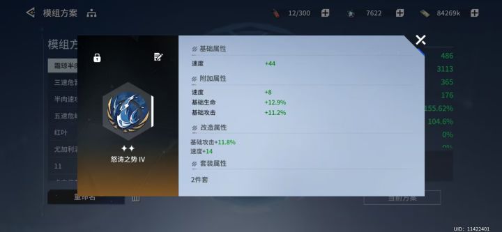 对于需要满速的C位,比如冷蛟、闪蝶(辅C,以控制为主)、尤加利(314,成本高数值高机制落后,落后版本基本不用)。本体满速能上竞技场的基本就这三个(不包括霆渊,霆渊很特殊)。模组基本选择4个到3个双暴加速度配上(6-4/3)个暴击加基础攻击加速度。冷蛟尤加利四森罗两怒涛即可,闪蝶想打输出就四霆闪两怒涛,只打控制就随便一套满速。主词条都是一样的456速度暴击基础攻击,改造就是本体属性对应的XX伤害+速度。