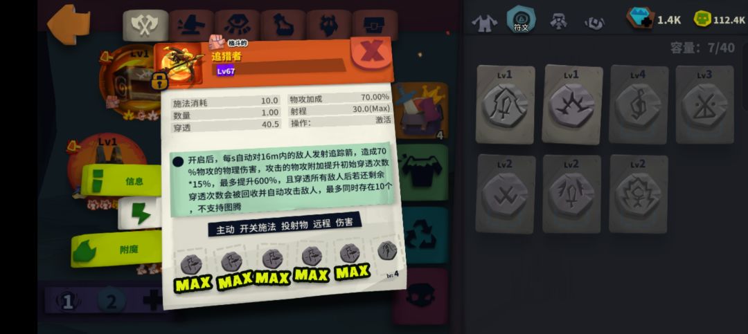 5个五级符文搭配天赋和词条(穿透次数增加30%)到40即可吃满追面板600%加成物攻