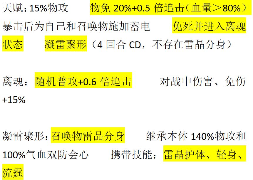 天赋给得很多且很实用,最让我惊喜的就是这个雷晶分身,跟赛特的那个差不多,但比赛特那个分身能力更专业,专注砍砍砍。然后这个免死效果说得有些不清楚,我猜应该是血量清空一次后转变成离魂状态,离魂状态还被打死那就是真死了。
