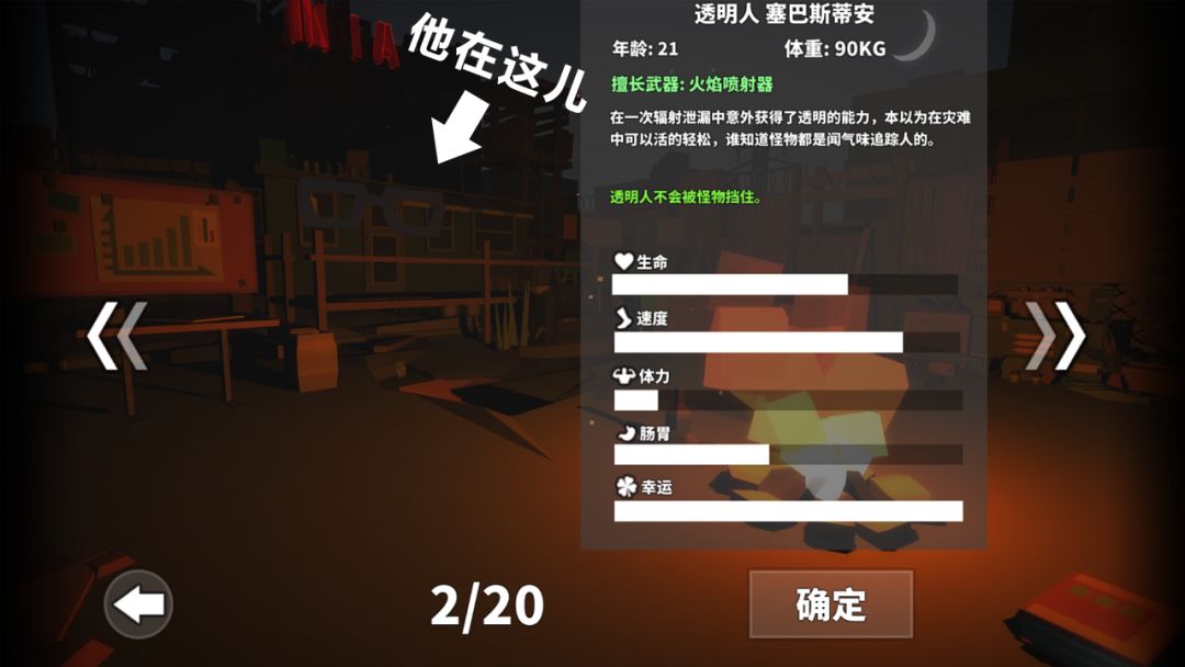 - 透明人 塞巴斯蒂安:他擅长的武器是喷火器,无视怪物碰撞。大家只看到他的眼镜!