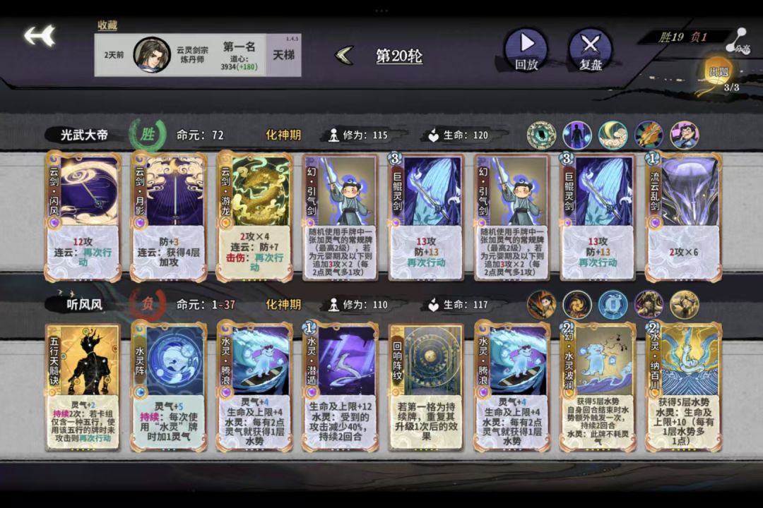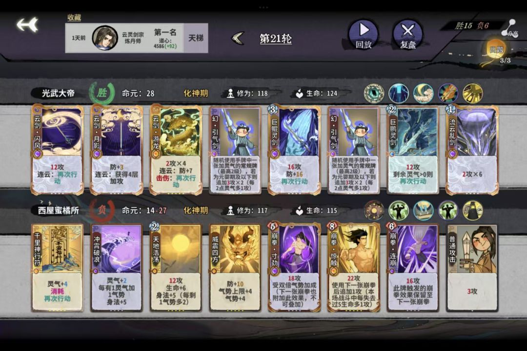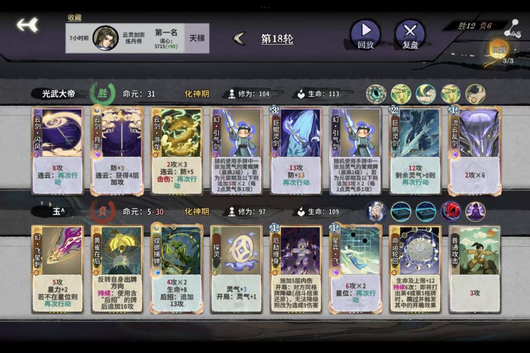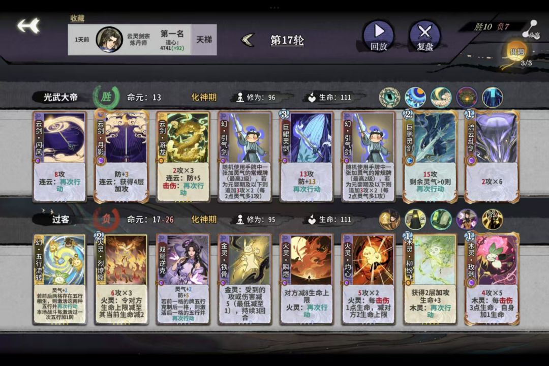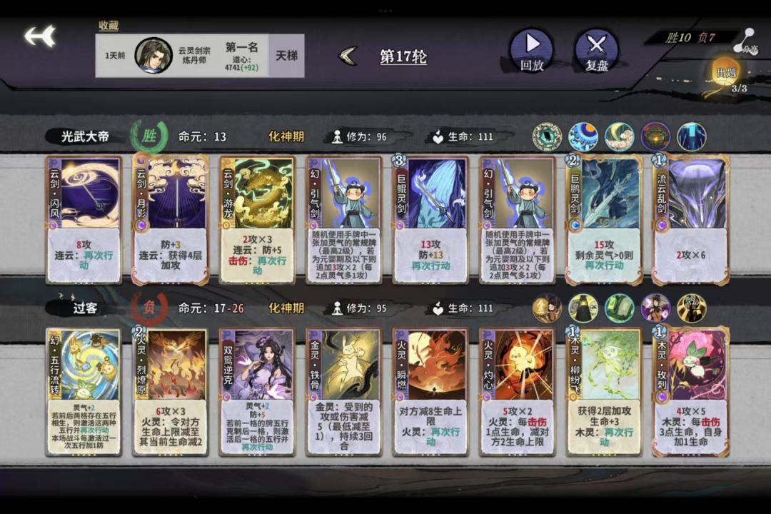 八轮元婴开启无脑大d模式,怎么牛逼怎么摆,不过记住手中必须保证有两张灵气牌,必须,保证至少可以上一张,引气引手里一张。苯人唯一一把速八就吃亏在实在找不到灵气(其实是犯蠢全走了),空有引气与一堆再动无法使用直接被打死。我们引气剑在元婴的战力极为恐怖,可以十一轮逆伐化神,甚至可以比肩削弱前的答辩。