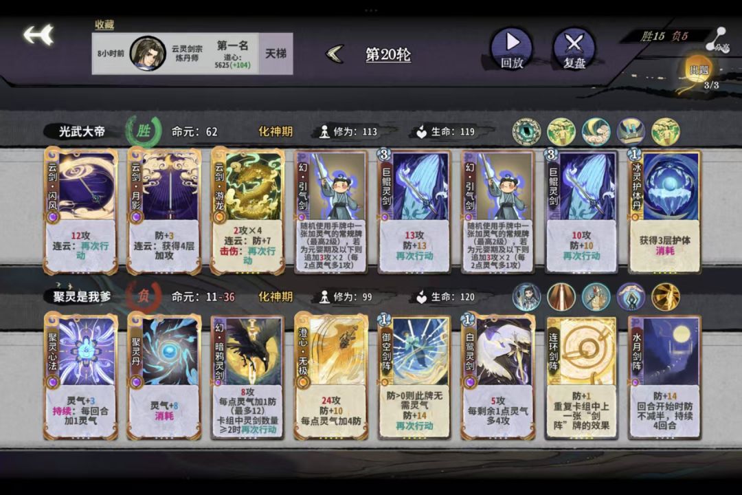 到了金丹,压力怪多了后我们可以不必局限于捡垃圾,可以每轮小d找金丹卡提升战力,依旧优先d云,不过除了柔心以外的三张金丹云剑需要留着,元婴期可以配合汇灵引气使用。依旧考验剑宗功底。