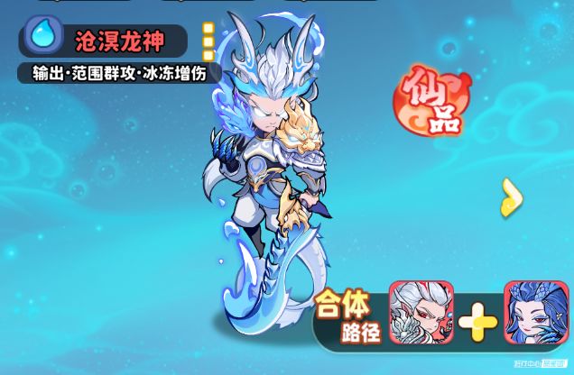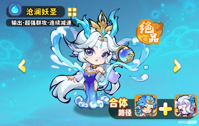 由敖闰、敖光两个角色进行合成,也是队伍的主要输出角色,不仅能够继承敖闰、敖光两个角色的所有技能,还能解锁3个全新技能。水龙吟:普攻时有几率触发额外攻击,能连续攻击两次,每次攻击还有小概率让敌人冰冻 ,在持续输出和控制上有作用,靠普攻触发,可补充伤害、干扰敌方行动。潜能觉醒:提升全场水系英雄的攻击和暴击率,是团队辅助型技能,能强化同系队友输出能力,让水系阵容整体伤害更可观。沧龙濯世:强化 “水龙吟”,多一次范围攻击,还能给敌人挂 “弱水” 状态,让敌人在减速、冰冻时受更高伤害,配合自身或队友控制技能,能放大输出,是打伤害、联动控制的关键技能。沧溟龙神是水系阵容核心辅助兼输出。自身 “水龙吟” 有输出和控制,“潜能觉醒” 能给全队水系加攻击、暴击,提升整体输出;“沧龙濯世” 进一步强化输出与联动控制,适合搭配水系队友,靠团队配合打伤害,能当输出补充,更是水系队伍的辅助增伤枢纽,让水系阵容伤害上限更高,在水系体系里,是能扛输出、辅助、联动控制的多面手 。2.沧澜妖圣(合体)
