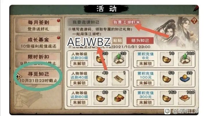 另外游戏右上角活动 寻觅知己 点我是小虾米 输入我的邀请码AEJWBZ,即可 最多可获得:400元宝+马车票+8万阅历+120体力+100洗髓丹+20顺脉丹!本人氪度已经拉满、可以领全部奖励!