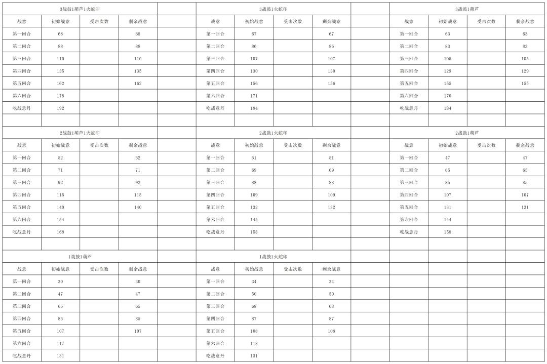 可以看到,初始的战意越高,后续的加成就越高,以我们刚才计算的提灯煞鬼为例,+10的战鼓和+15的战鼓第六回合足足错了24点战意,总伤害提升超过了9%。而携带2战鼓的时候火蛇印和葫芦的加成就差不多了,只有二者叠加会有不错的效果。但是战意仅仅只是众多伤害加成中的一项,我们在战意上占的资源多了,其他增伤项就要减少,所以并不是战鼓越多越好的,还是需要一个平衡,而如何能最大化伤害,请看我接下来的帖子。