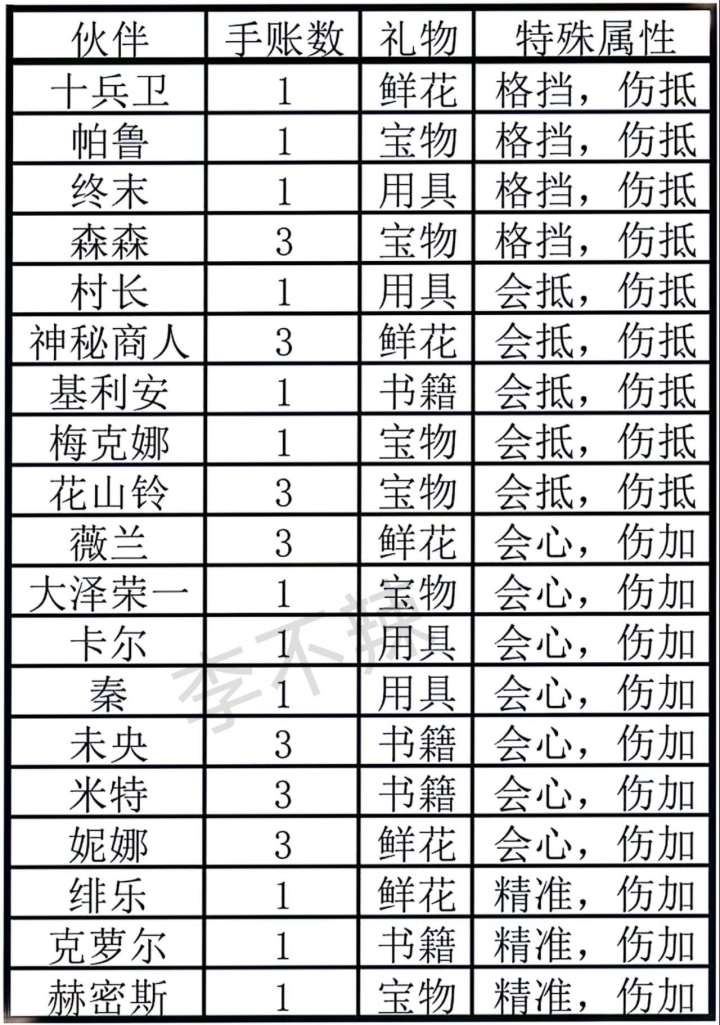 伙伴所需礼物及特殊属性