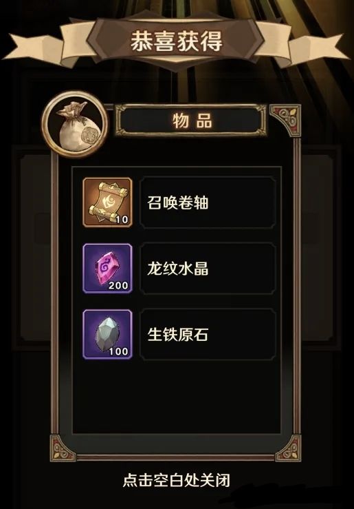 :召唤卷轴*10 龙纹水晶*200 生铁原石*100