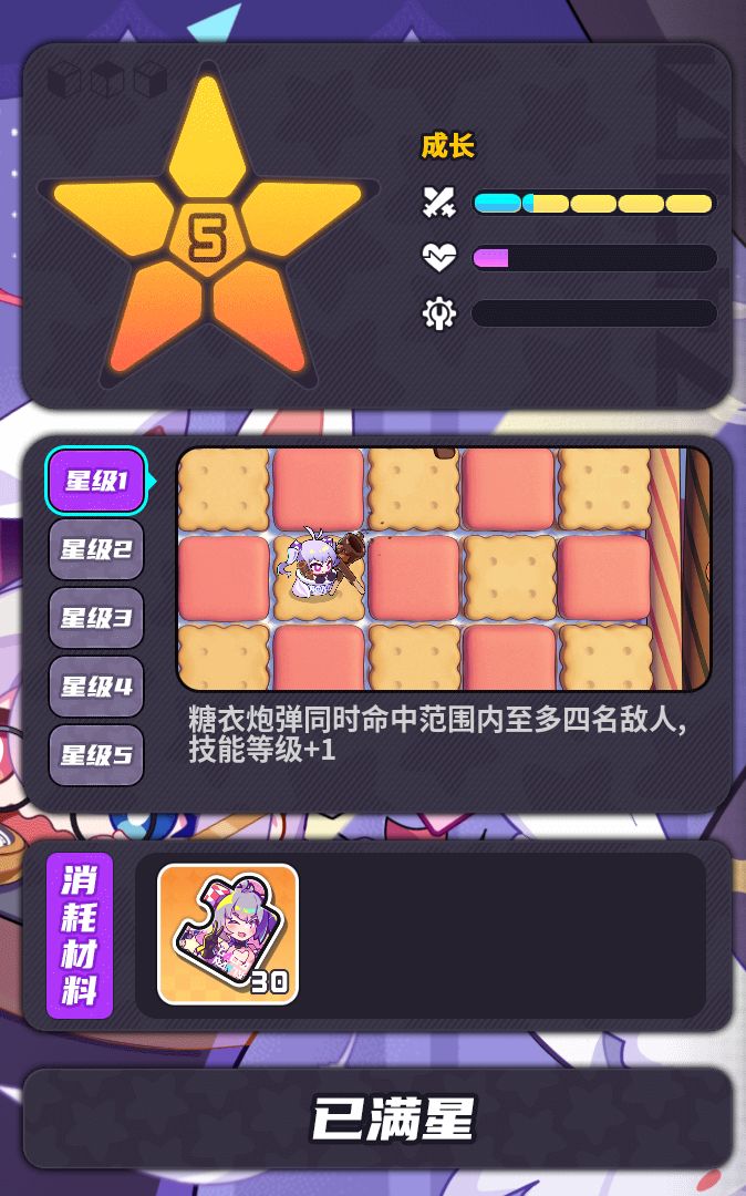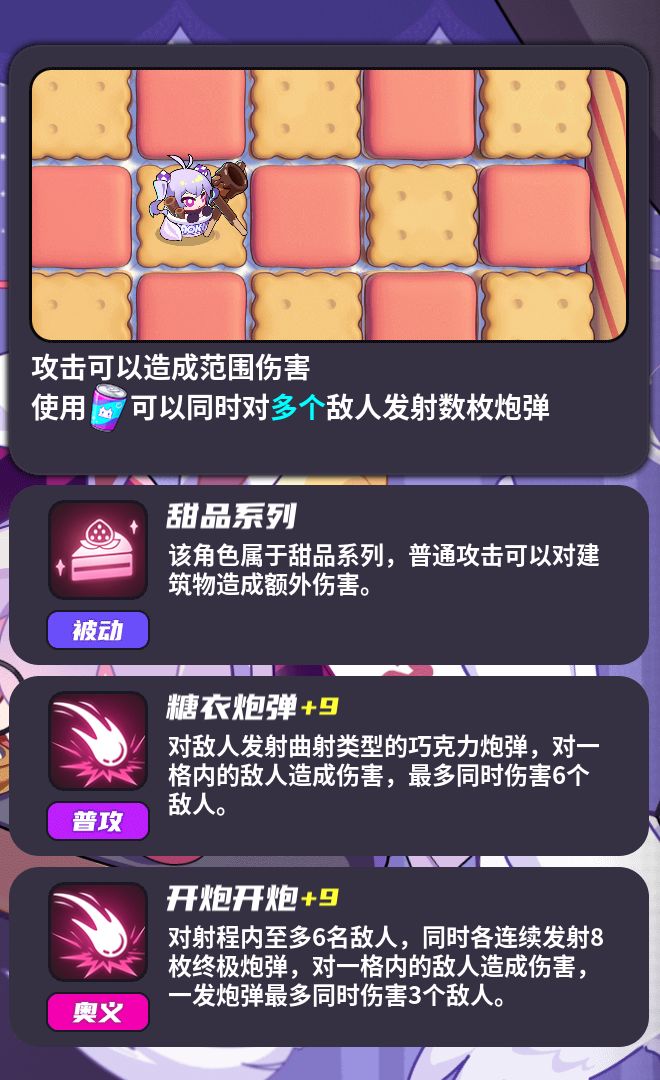 1.甜蜜迫击炮:高伤害抛射,1/3/5星分别可同时攻击4/5/6名敌人(要求敌人在一格内)