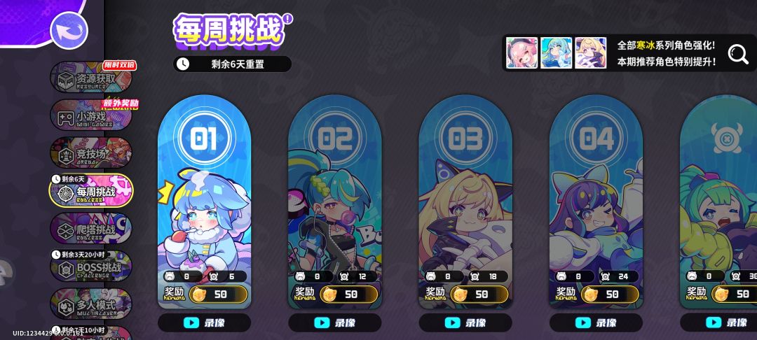4.每周挑战:一周刷新一次,每关可得50水晶,共10关