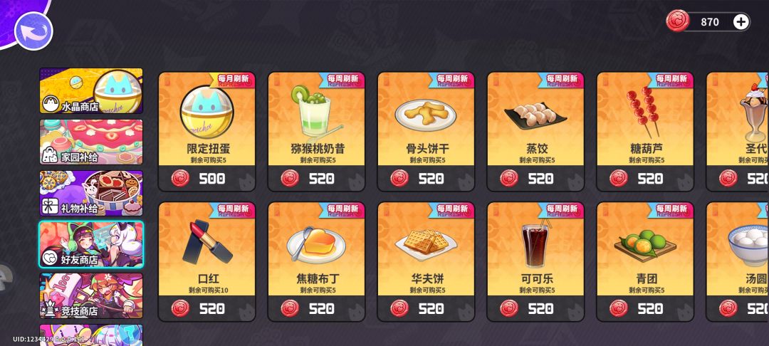 5.好友商店:可兑换限定扭蛋和好感度礼物,扭蛋必换,其余看情况兑换