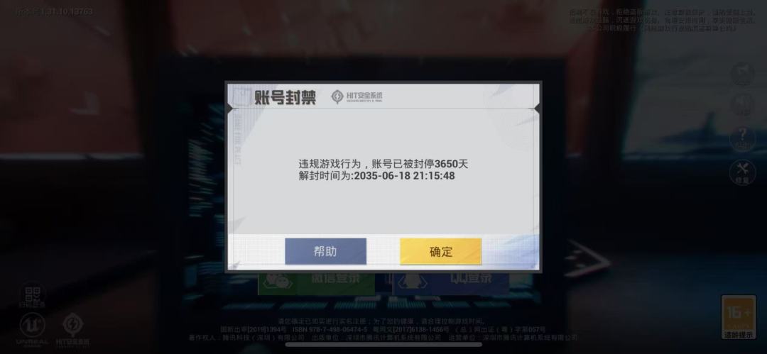 6月20号,提示 【破坏游戏公平性】被封号10年。