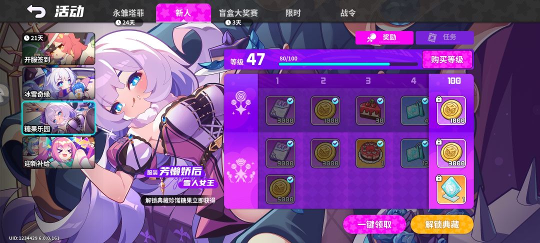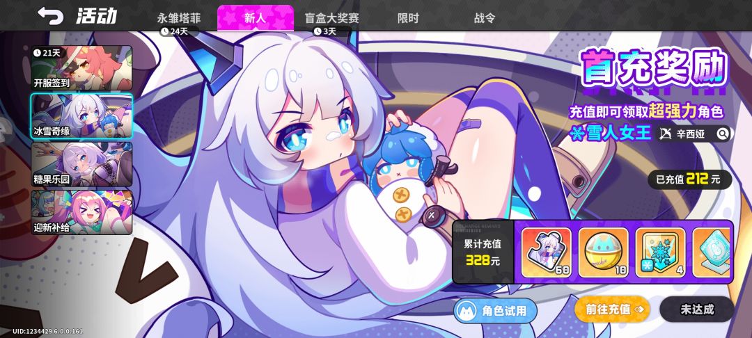 15.首充奖励:可领取T0角色雪人女王,累计充值648元可得满星雪人女王,奖励领取分别在6/30/128/198/328/648元(我记得是这样的)