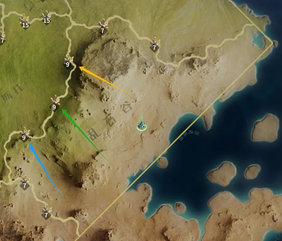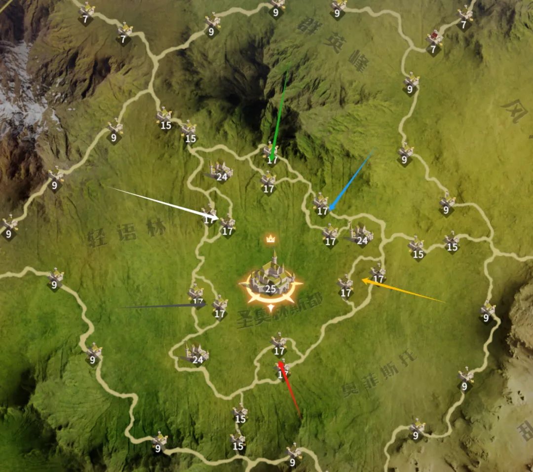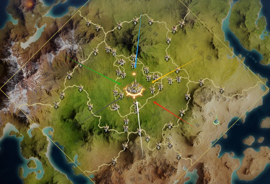 第二阶段:在游戏进行到一定阶段后,会开放更靠近中心的资源州,资源州为奥菲斯托、轻语林、群英峰。资源州的可攻打的副本和采集资源地均高于出生州,可争夺的城池等级和积分也高于出生州。并且只有资源州能通向最终的争夺点中心州。