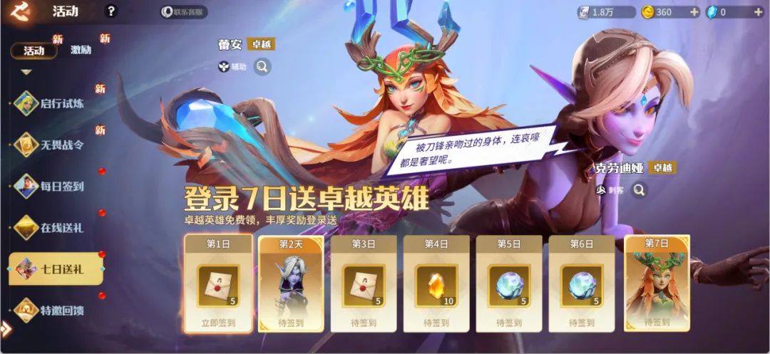 七日送礼:登录送2位强力卓越英雄登录游戏即可领取对应奖励,登录2日可得卓越英雄「克劳迪娅」,7日可得卓越英雄「蕾安」。