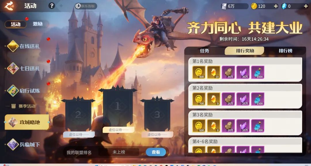 攻城略地:联盟齐力,攻城冲榜根据联盟的占领城市的总势力值排名结算奖励,奖励包含龙币、英雄邀请函和丰厚资源。