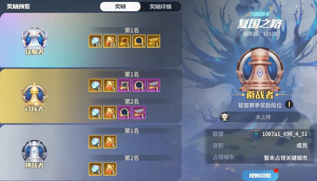 结算奖励:处于“征服者”联盟内的联盟成员,可以领取“征服者”结算奖励。处于“讨伐者”联盟内的联盟成员,可以领取"讨伐者”结算奖励,以此类推。