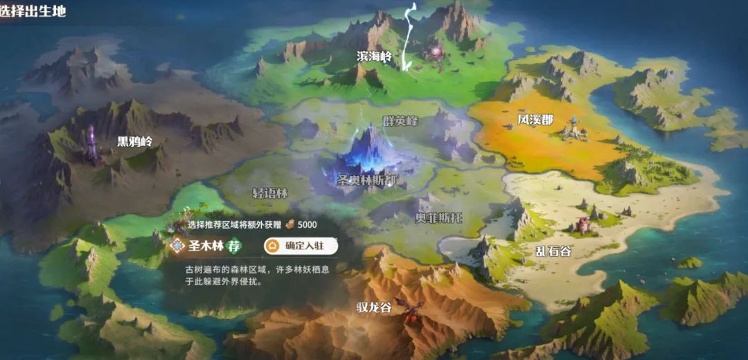 第一阶段:进入游戏后可选择的州为出生州,也就是最外围的一圈,分别为黑鸦岭、滨海岭、风溪郡、乱石谷、驭龙谷、圣木林。