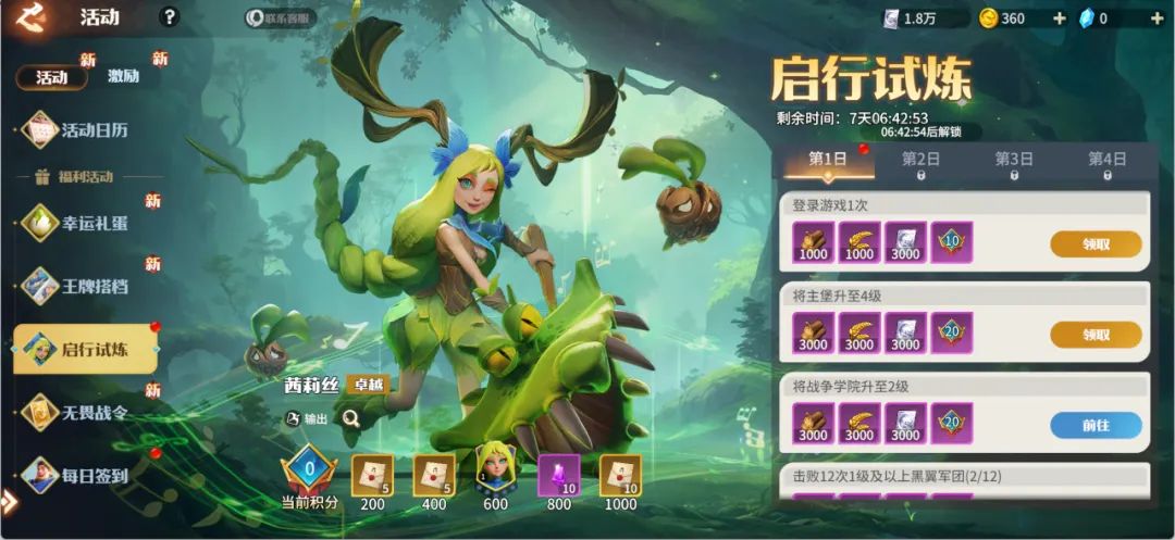 启行试炼:解锁强力输出英雄「茜莉丝」创角后逐天解锁挑战任务,完成任务合计可获得20英雄邀请函和卓越英雄「茜莉丝」。