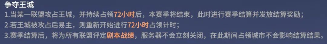 每个赛季的主要目标是以组成联盟并提升自我实力,与盟友协力攻陷各大城池,争夺更高的联盟排名,获取更丰厚的结算奖励为主要目标。