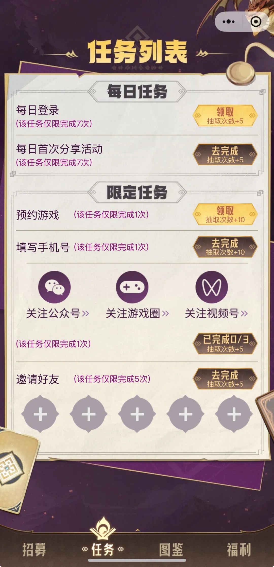 1、预抽卡活动是《龙石战争》公测预热活动,玩家可以通过完成一系列任务获得招募次数完成预抽卡。全部任务做完累计有120次招募次数。