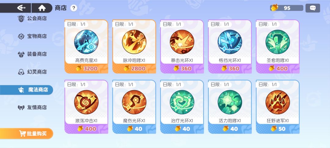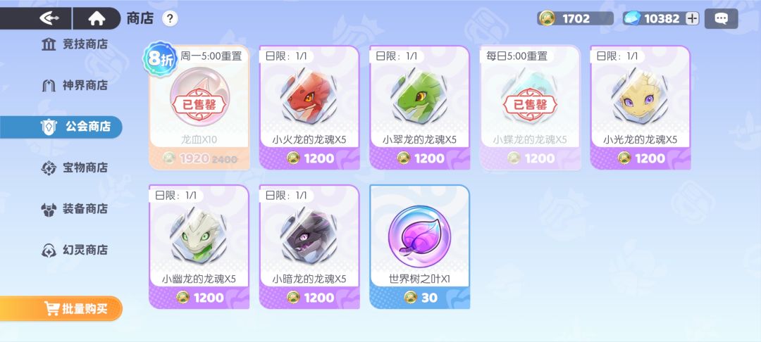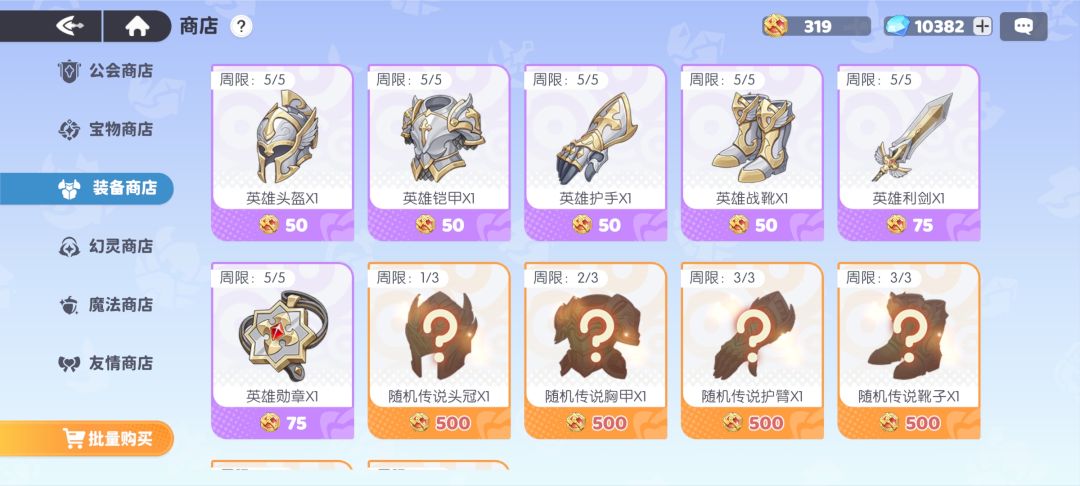装备商店:只买传说装备,幻灵缺什么装备买什么,一般先买500币的装备,先凑共鸣提战力,武器和饰品可以在冠军讨伐中拿