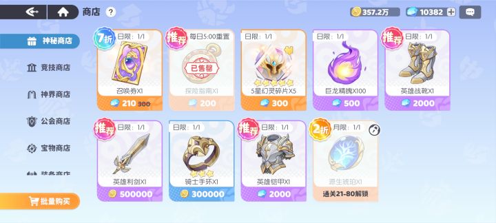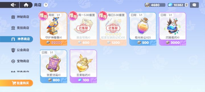 神界商店:号角先买满,每天买美杜莎碎片和极光粉尘