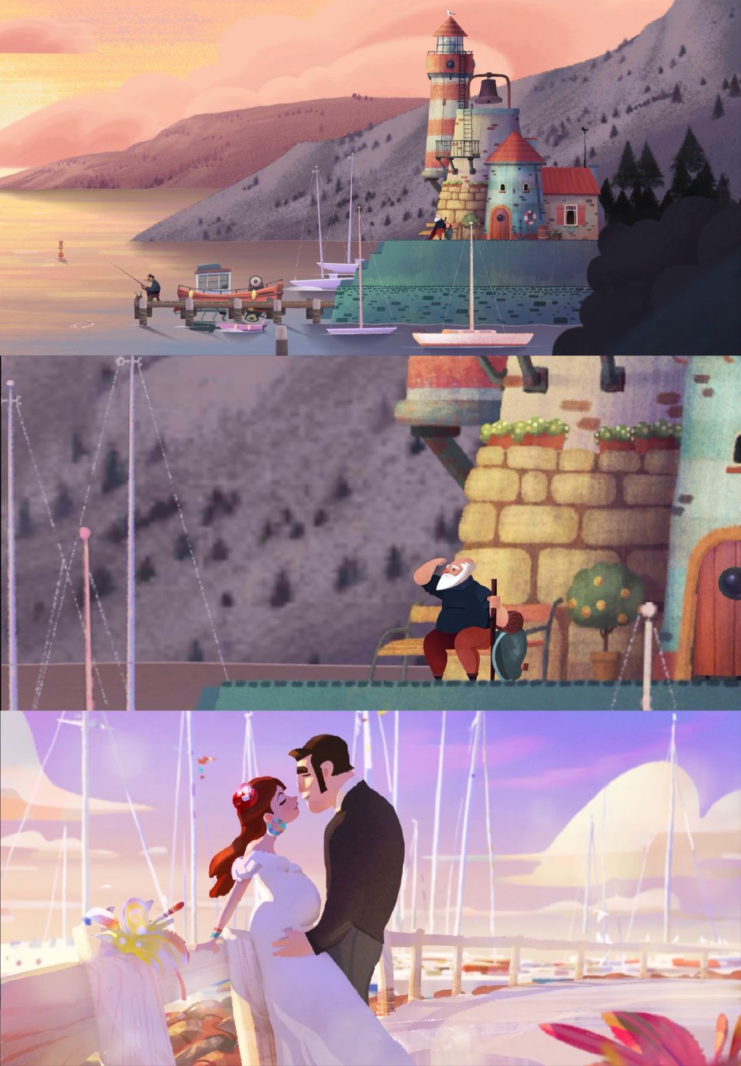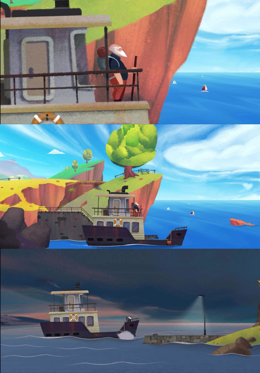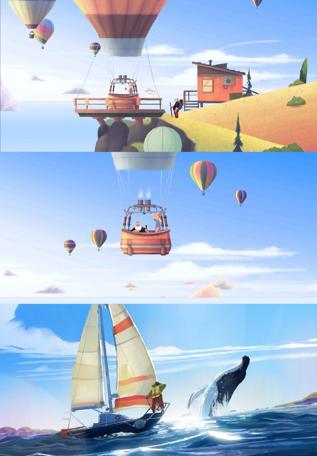故事从老人收到家人的信开始。老人年轻时是一名水手,在一个酒会上遇到了心爱之人。他们一起驾车出游,一起领略美好风光。终于,在一艘小船上,他向心爱的女孩求婚。他们结为夫妻,并且迎来了小女儿。慢慢地,他开始怀念曾经驾船出海的时光,无数次翻看地图,畅想着重新冒险的生活。一个雷雨交加的夜里,妻子和他争吵起来,一怒之下,他不顾小女儿的挽留背着包离开了家。他如愿出海航行了,去探索海洋,去欣赏晚霞,海鸥随行,鲸鱼相伴,一次次美妙的航行慰藉着他的心灵。