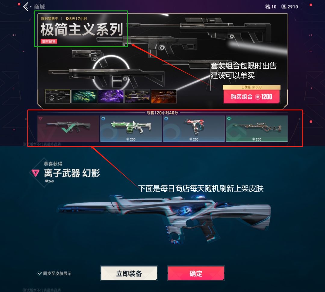 1-1--目前唯一购买方法,在商店购买通过测试币如图上面是限时出售套装皮肤可以单买或者整套!