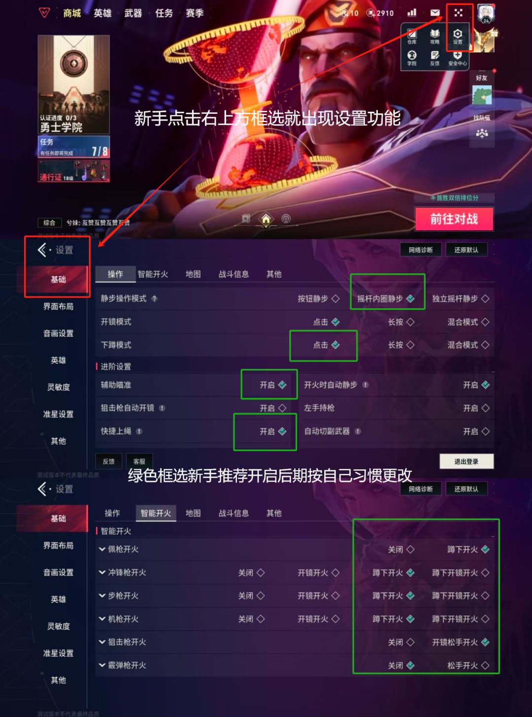 1-2--进入设置后 “基础设置中操作” 图中框选新手推荐开启(这些都是智能辅助功能适合新手玩家)