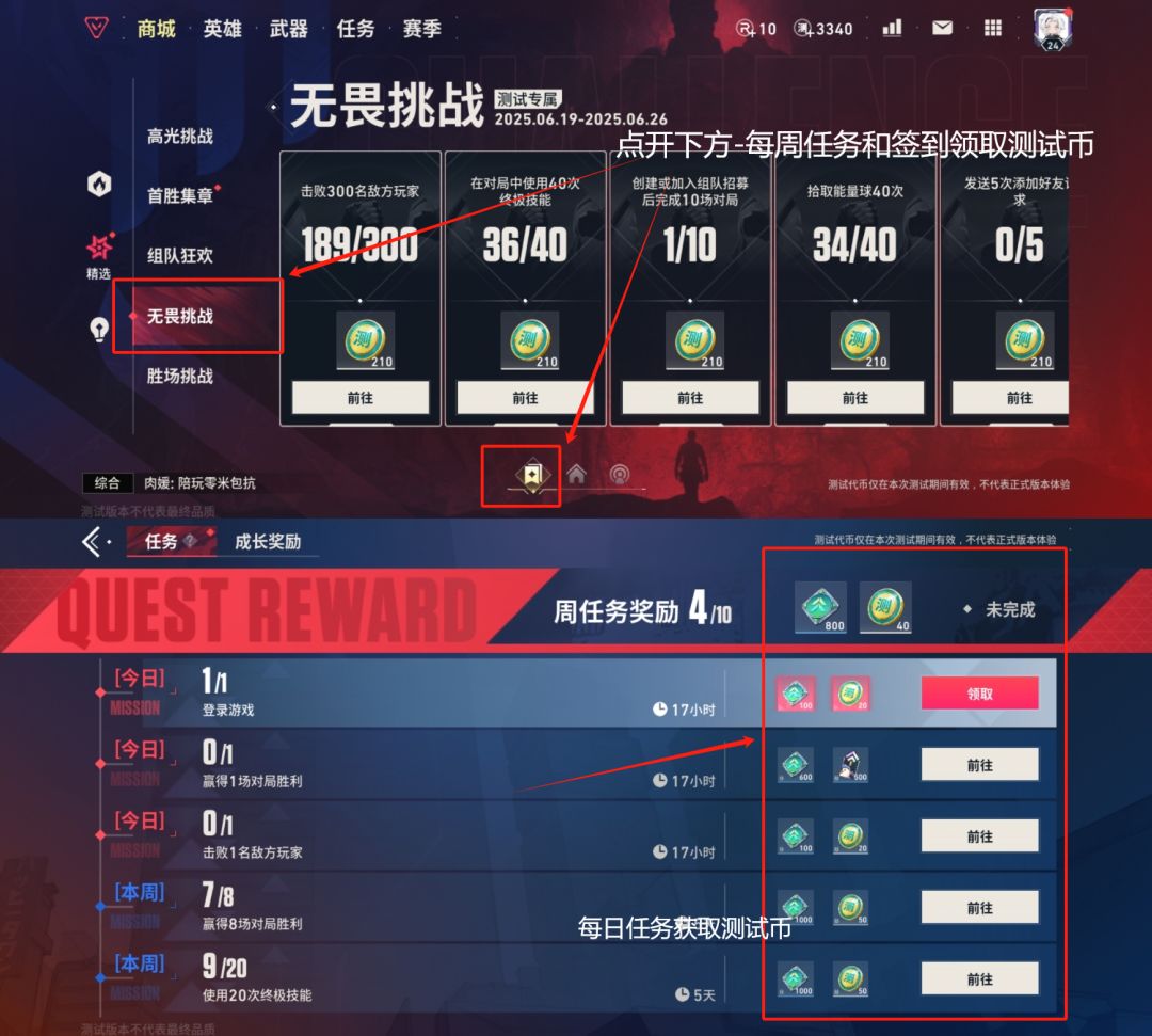 1-2--通过如图每周无畏挑战完成任务领取测试币(每周刷新任务)