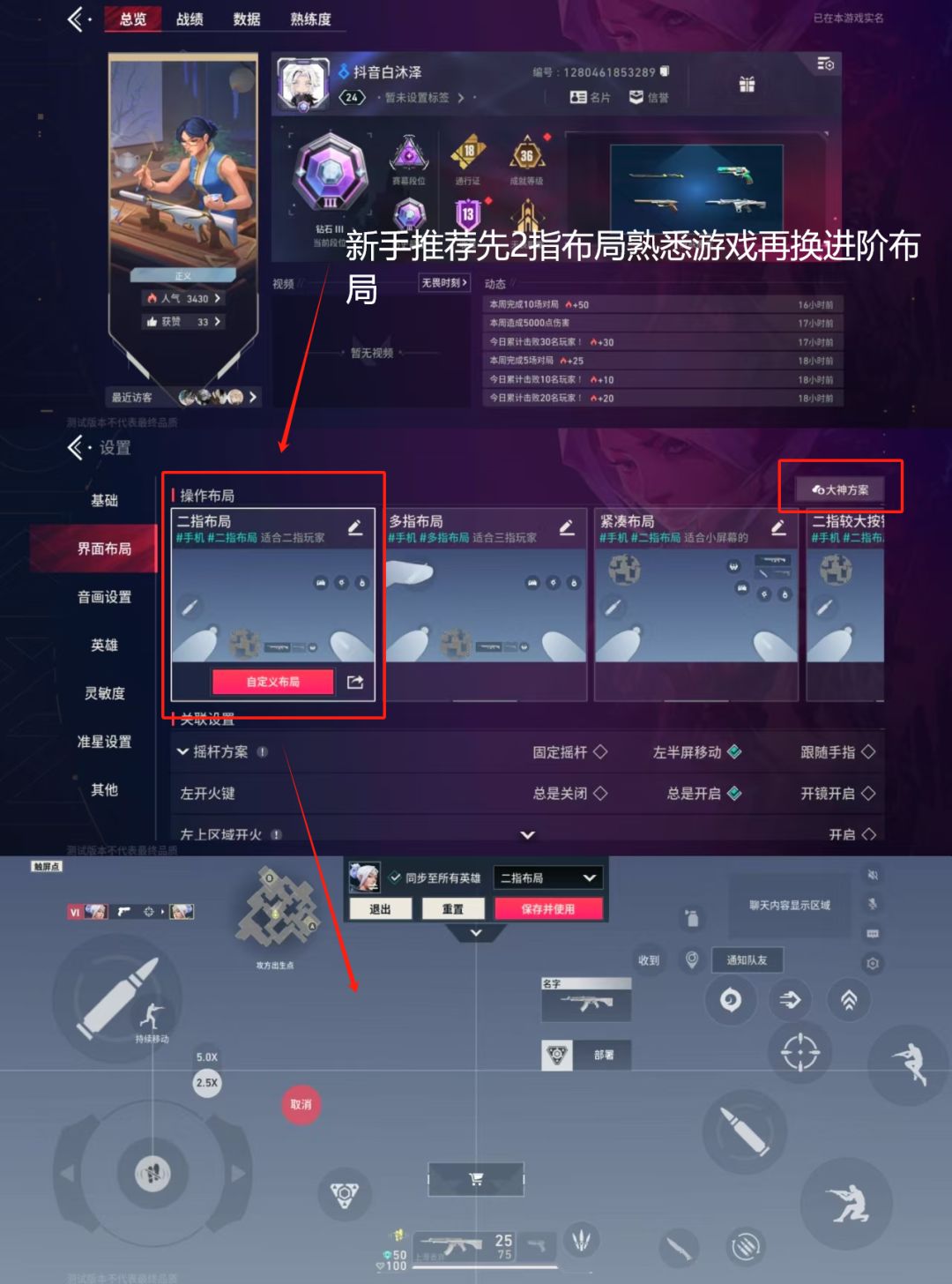 1-1--新手推荐用二指布局并开启智能开火等辅助设置上手会比较快!!右上角会有大神键位和官方推荐一键应用。