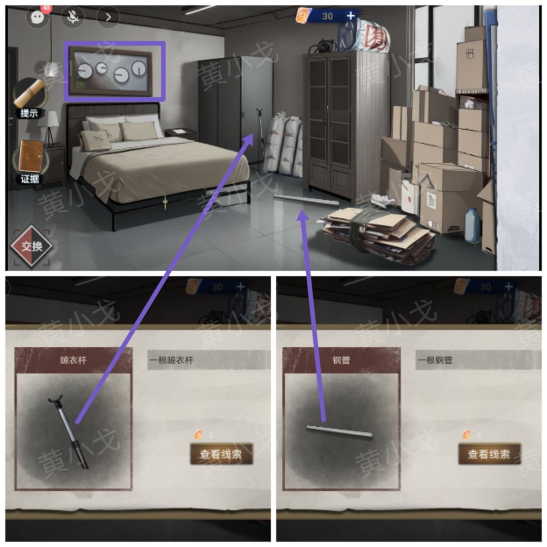 1.拾取地上的【钢管】;柜子旁边的【晾衣杆】
