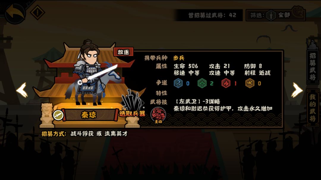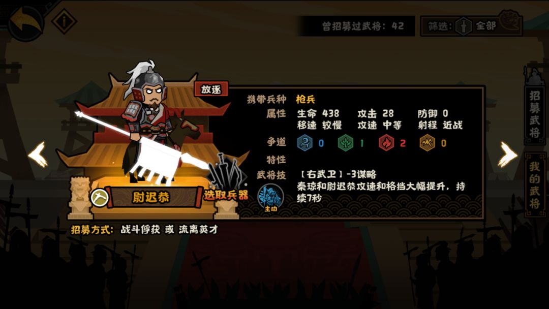 分别介绍一下两个武将吧,先说秦琼,步兵模板,有林火两争道,武将技需要3点谋略(常规情况下需要等24秒),武将技冷却为20秒,使用后与尉迟恭一起获得300点护甲,并会永久提高0.035的攻击成长。