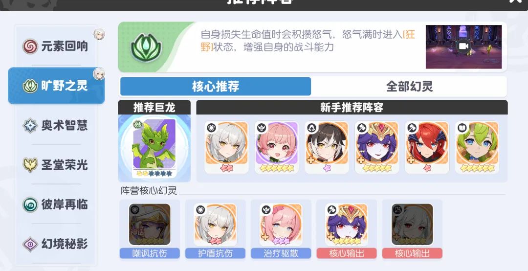 旷野队用来做二队的其中一个好处便是可以直接嫁接元素队的奥伯隆妮与齐格菲这两个幻灵,这就省去我们重新培养两个主力的成本了,而且在很多朋友获取灯神之前,仙后也是元素队的奶妈首选,而仙后除了元素阵营外还有一个便是旷野阵营,因此如果大家有练了仙后的话,我们甚至可以直接从元素队转3个成型幻灵到旷野队。当然针对旷野队剩下的3个位置嘛,刺客位其实可以直接用送的白虎,法师位则可以用四季鹿灵,最后的射手位则可以考虑鸦灵,这三位角色维一也大致给个强度或培养优先级的评级吧,在旷野阵营下白虎可以达到T2左右,鹿灵也可以达到T2左右,鸦灵则可以达到T1-T2之间的强度表现,大家可以略作参考,因为后续还会有其他更优秀的幻灵上线替代这几位。哦对了,特别提一句旷野队的牛头,这位战士的强度上限极高,但是也需要极高的练度支撑,最终练到彩星后......或许大家就能见识到游戏天花板般的战士表现了,最后在守护位上如果有一定练度的雅典娜,直接替换奥伯隆妮也是不错的选择。